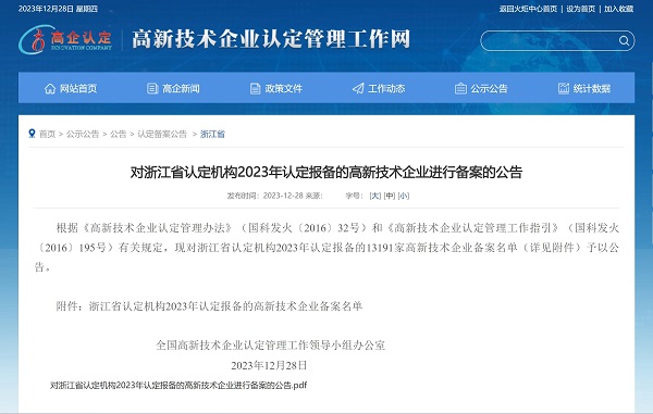 2023年12月28日,全國高新技術企業認定管理工作領導小組辦公室發布《對浙江省認定機構2023年認定報備的高新技術企業進行備案的公告》,中國能源工程集團有限公司(以下簡稱“中國能源工程集團”)所屬中清能源(杭州) 有限公司...